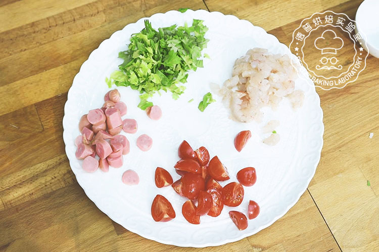 1、欧芹叶、虾仁、热狗、圣女果分别切碎备用